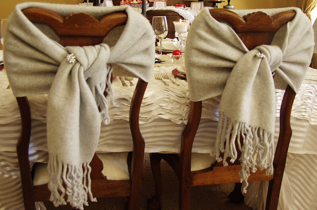 Last, check out these gorgeous chair wraps that double as a cozy gift for the guests. These were so easy to create from a length of fleece fabric and some glamorous hairpins. Just cut to size, cut strips in the ends and pull to curl them!